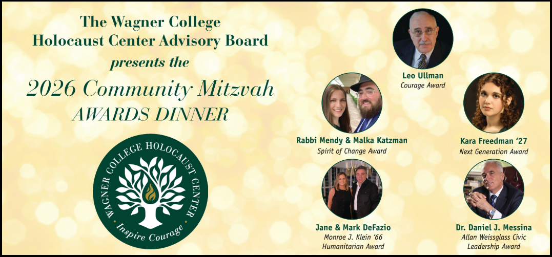 Please join the Wagner College Holocaust Center Advisory Board at the annual Community Mitzvah Awards celebrating our 2026 honorees: Mr. Leo Ullman, Rabbi Mendy & Malka Katzman, Dr. Jane & Mr. Mark DeFazio, Kara Freedman '27, and Dr. Daniel Messina.
