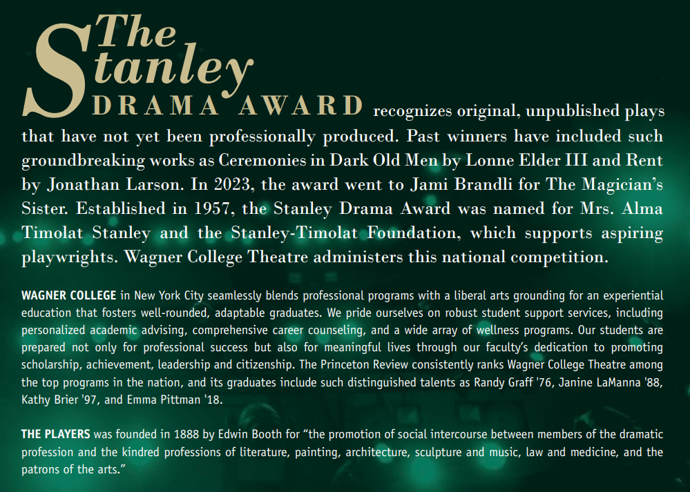 The Stanley Drama Award was established in 1957 by Mrs. Alma Timolat Stanley in conjunction with the Stanley-Timolat Foundation, which supports aspiring playwrights. This national competition is administered by the Theatre Department of Wagner College, with past judges including such notables as playwrights Edward Albee and Paul Zindel, actresses Geraldine Page and Kim Stanley, and producer David Susskind. Past winners, which were chosen for this award before they were professionally produced, have included such groundbreaking works as Ceremonies in Dark Old Men by Lonnie Elder III and Rent by Jonathan Larson.